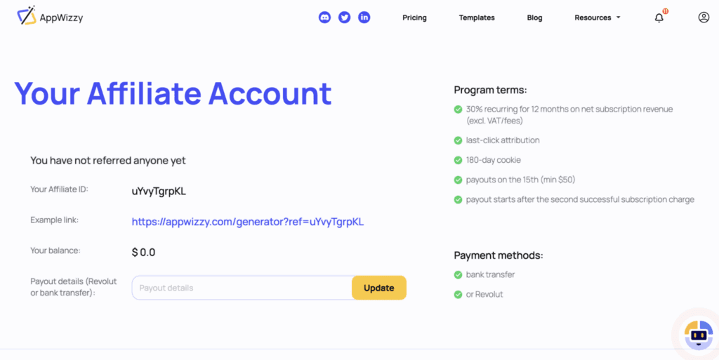 • AppWizzy pays 30% recurring commission for 12 months on net subscriptions and all credit top-ups (excluding VAT/fees).