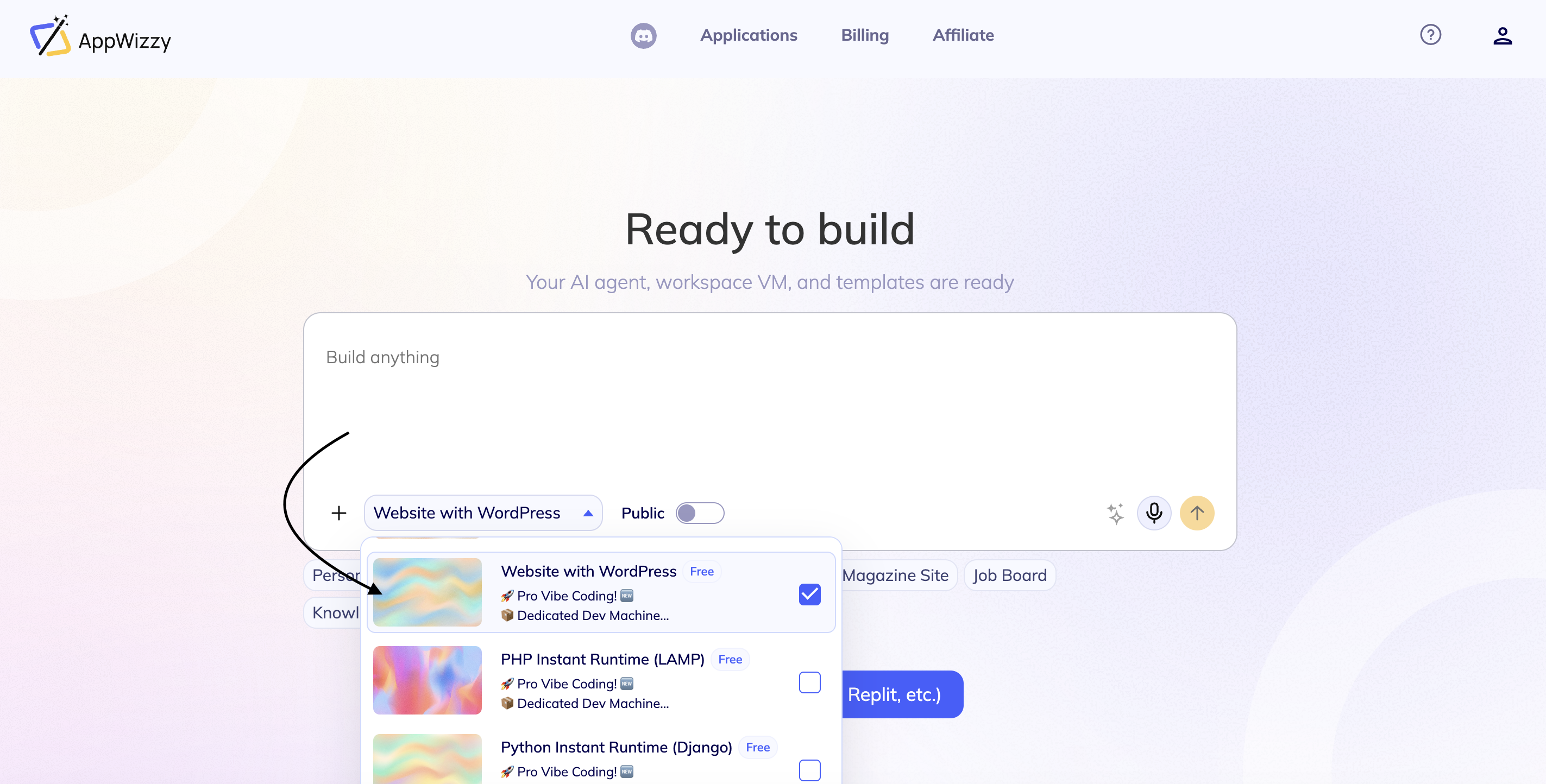 We are happy to introduce a new Appwizzy WordPress Website Template designed to help you build production-ready websites with WordPress using an AI agent. The template runs inside a dedicated sandbox virtual machine and generates a fully configured WordPress instance on a standard, production-ready LAMP stack.